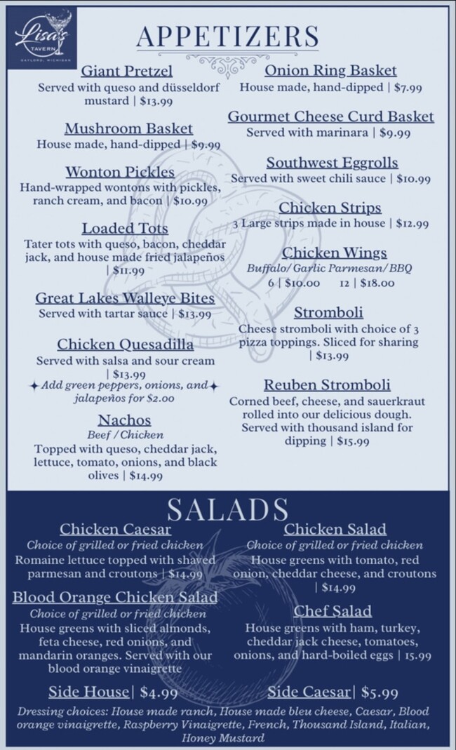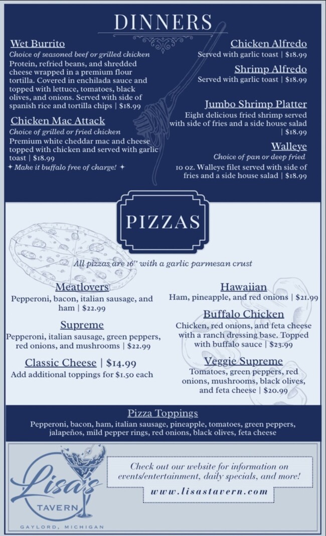 © 2025 Lisa's Tavern. The place to be in Gaylord, Michigan. Designed by JCC Marketing Group